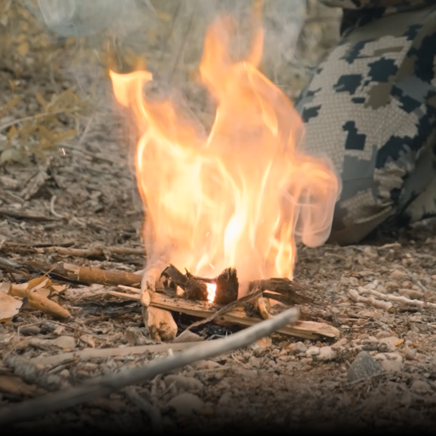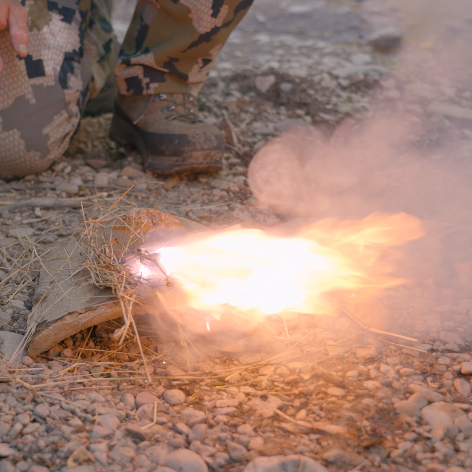 Tear a piece off to expose the fibers, place in the center of a “nest” of tinder/kindling, and light (we prefer a ferro rod). You can also mold to the end of a stick to make the ultimate match!